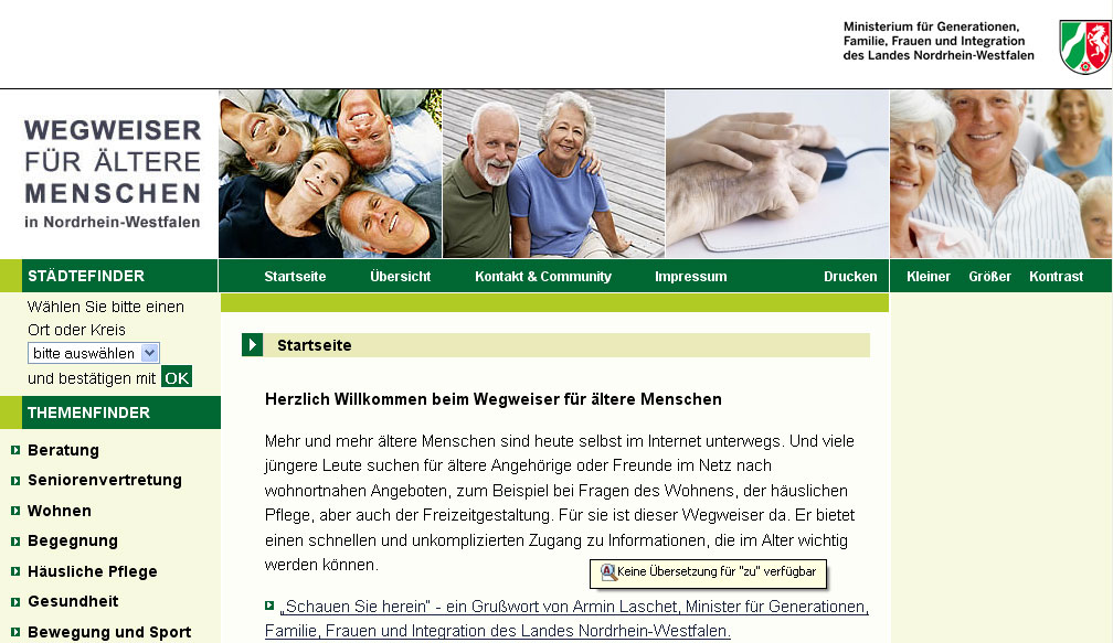 ür Generationen, Familie, Frauen und Integration des Landes Nordrhein-Westfalen, des Kuratoriums Deutsche Altershilfe und der Landesseniorenvertretung NRW e.V., u. A. offizielle Freischaltung des Seniorenportals 50plus durch Minister Armin Laschet (Unsere Leistungen: Technische Beratung und Betreuung, Qualitätskontrolle, Durchführung der Präsentation)