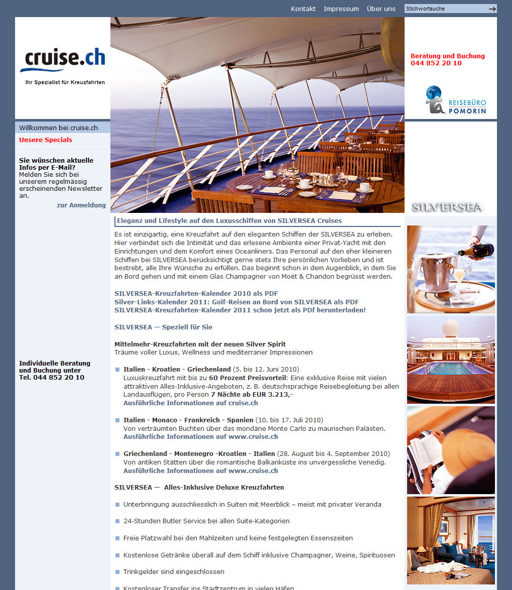 Mehrere Google AdWords-Kampagnen für die Internet-Präsentation "cruise.ch" des Reisebüros Pomorin (Unsere Leistungen im Auftrag der Webworker GmbH: Konzeption und Administration der Kampagnen, Konzeption, Design und Produktion der Landingpages)