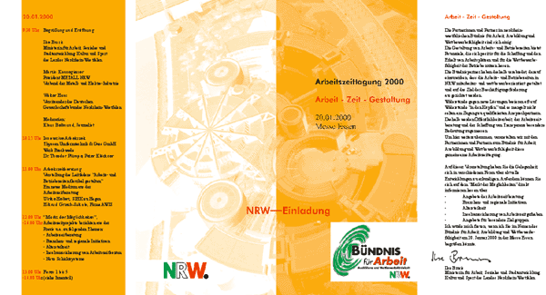 Arbeitszeittagung 2000: Arbeit - Zeit - Gestaltung, Einladung des Bündnis für Arbeit, Ausbildung und Wettbewerbsfähigkeit NRW (Unsere Leistungen: Design, Layout, DTP)